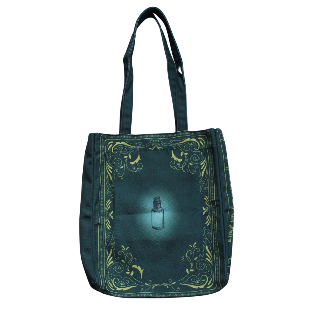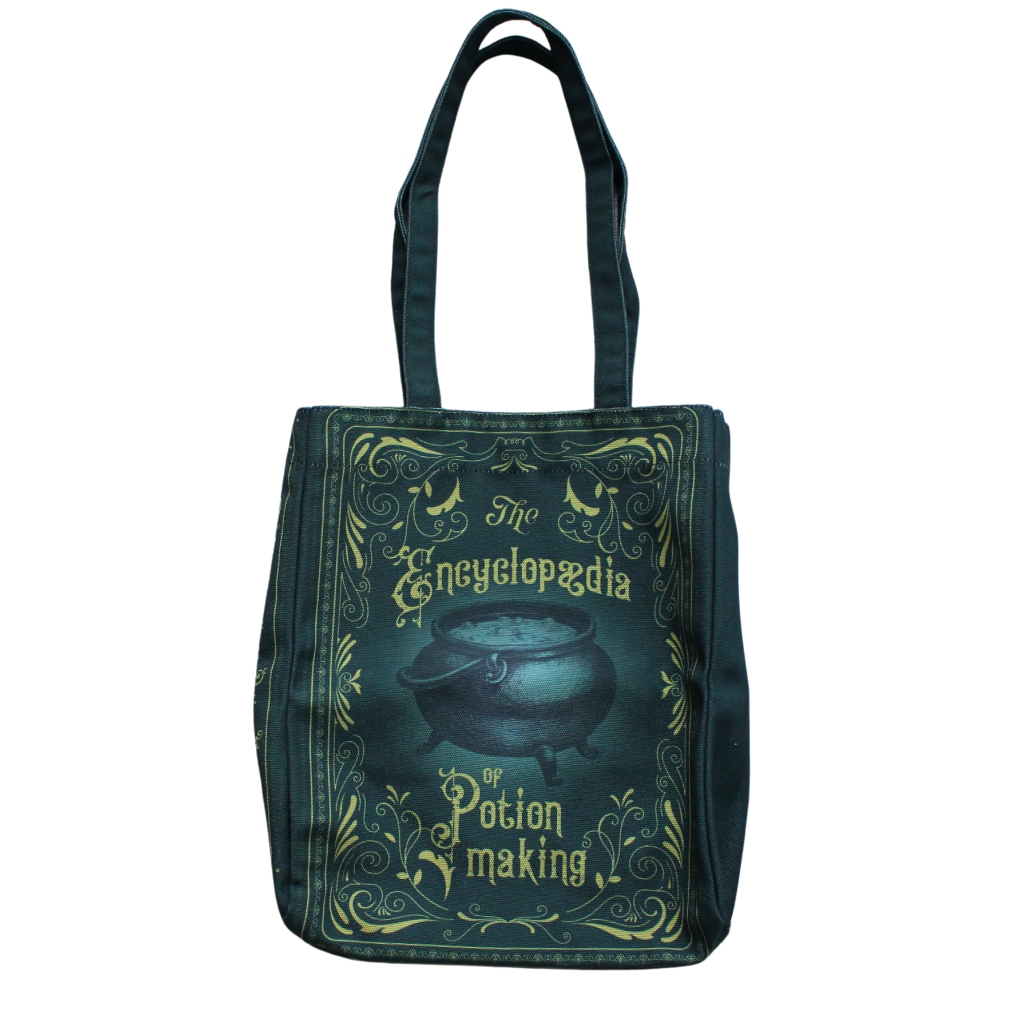 Perfect for carrying all your daily necessities, from groceries to textbooks, this tote bag is sure to make you stand out! This handy tote bag depicts The Encyclopedia of Potion Making, featuring ornate gold detailing on a dark green background with a central illustration of a cauldron. The corners are adorned with gold metal protectors, enhancing its antique charm. The design perfectly captures the old-world, magical essence of potion making. It is a durable and useful design with an extra inner pocket for your small items and a magnetic clasp for the main compartment. The back of the bag features an illustration of a potion vessel bottle, adding to its apothecary allure. Whether attending a magical gathering or going about your daily routine, this bag is sure to infuse a touch of magic into your outfit.