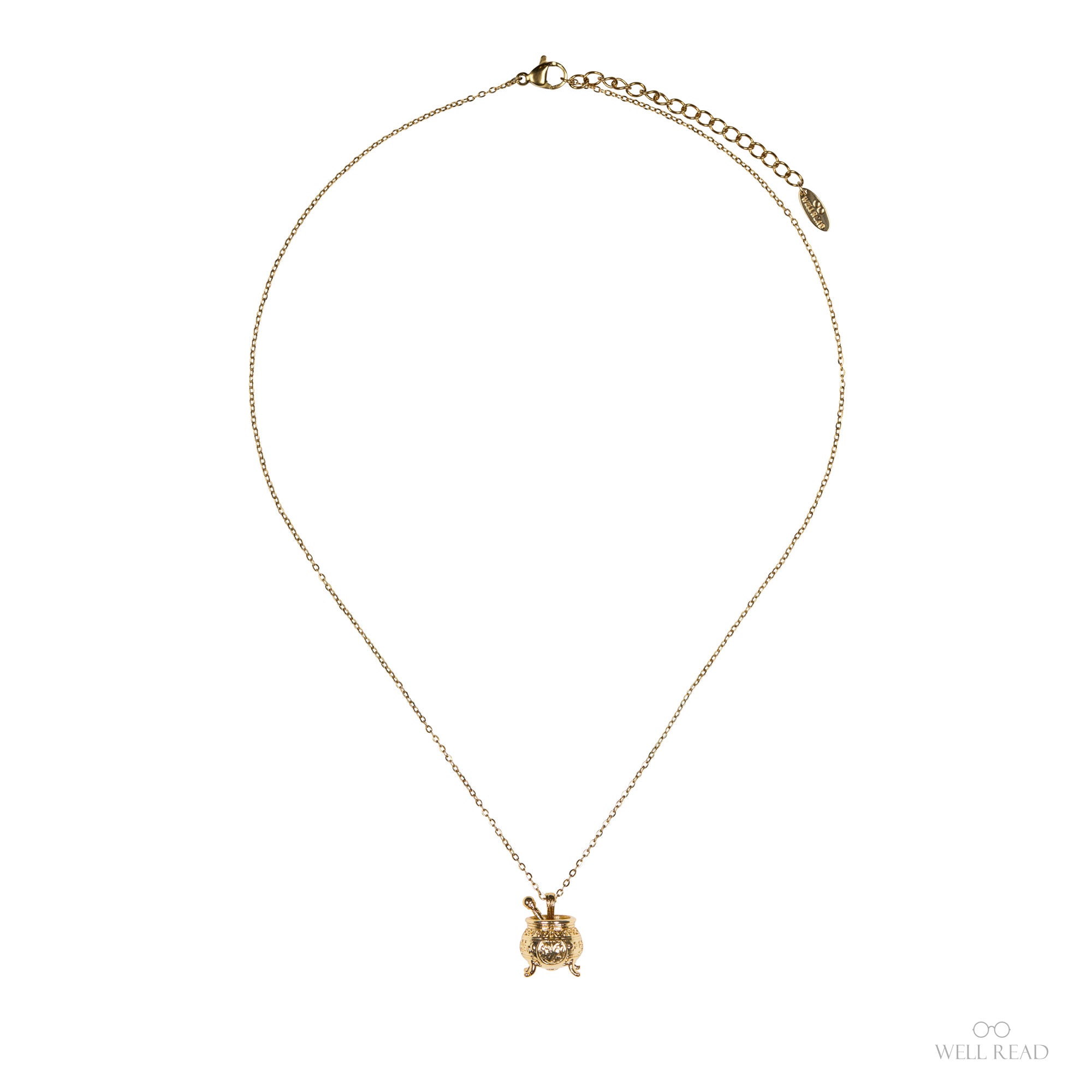 The pendant features a miniature golden cauldron, complete with tripod feet and a tiny stirring spoon poised at the rim—as if paused between clockwise and counter-clockwise turns. Rich texture gives it the look of well-loved brass from a lamplit, cobbled-lane shop, yet it retains a refined gleam. Suspended from a slim, adjustable gold chain, it layers beautifully with crisp collars and cardigans, and pairs perfectly with our The Encyclopedia of Potion Making book crossbody bag.