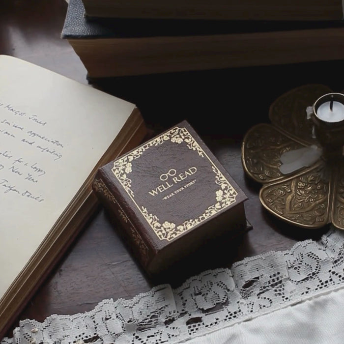This charming, book-shaped jewellery box is the perfect home for your bookish necklaces. Its vintage-inspired design protects your jewellery and serves as a decorative piece. The luxurious velvet interior keeps your necklace tangle-free, whilst the exterior resembles a classic novel with intricate gold detailing. An ideal gift for book lovers and jewellery enthusiasts alike.