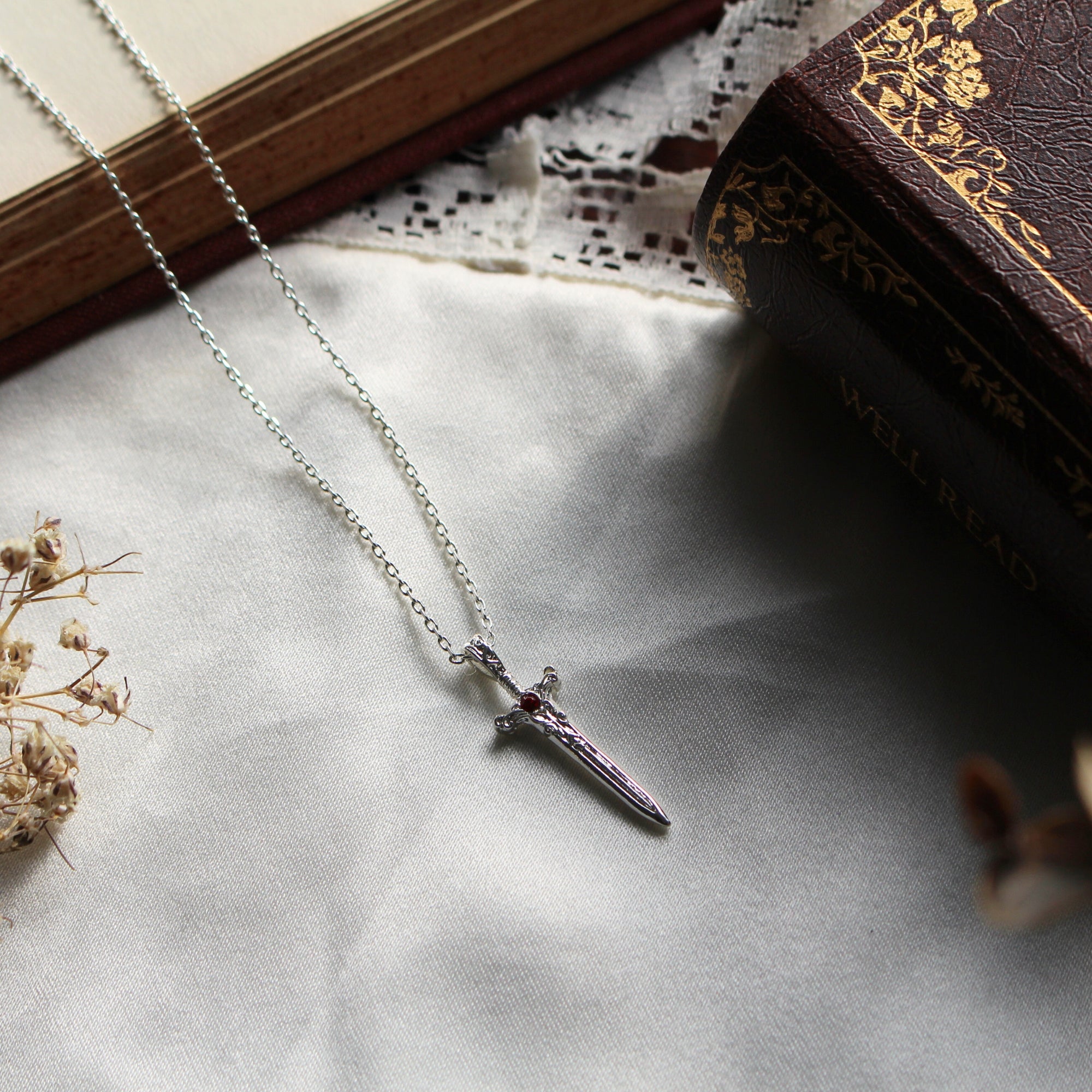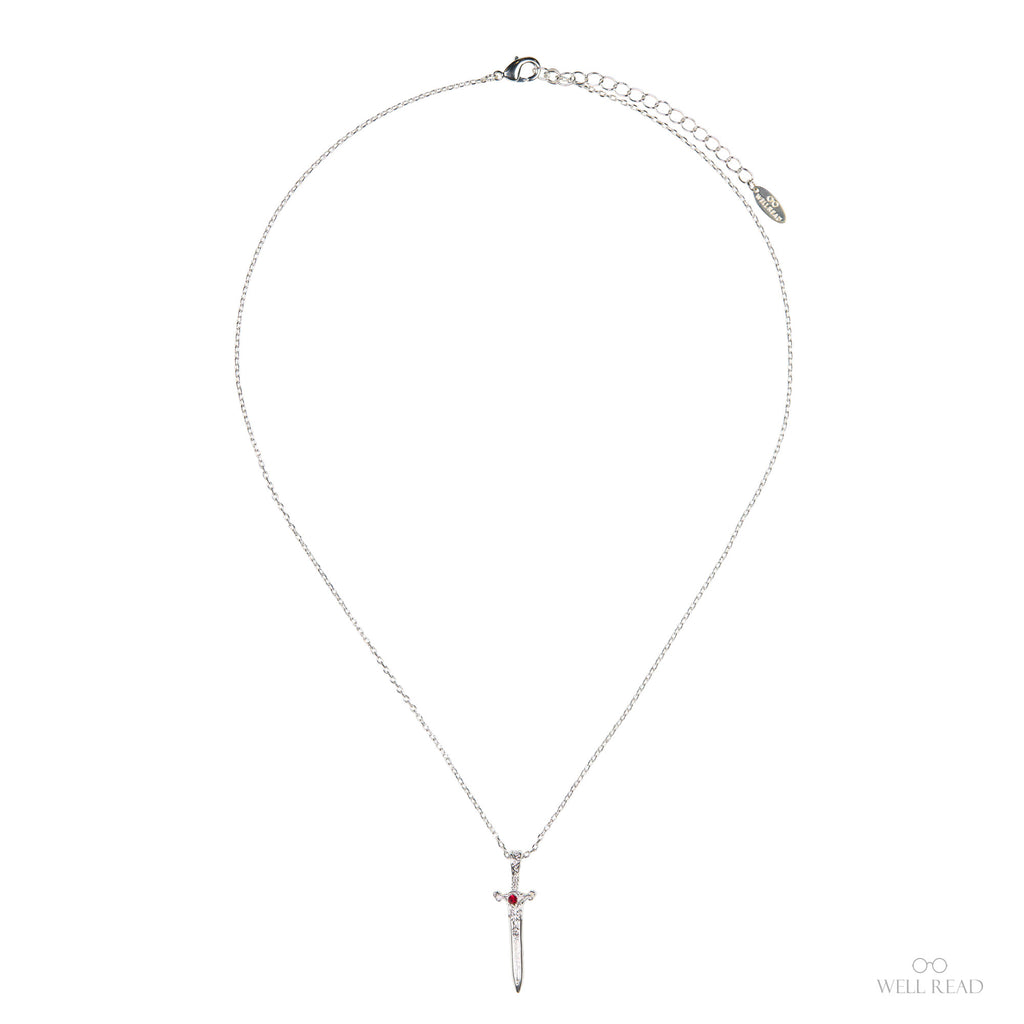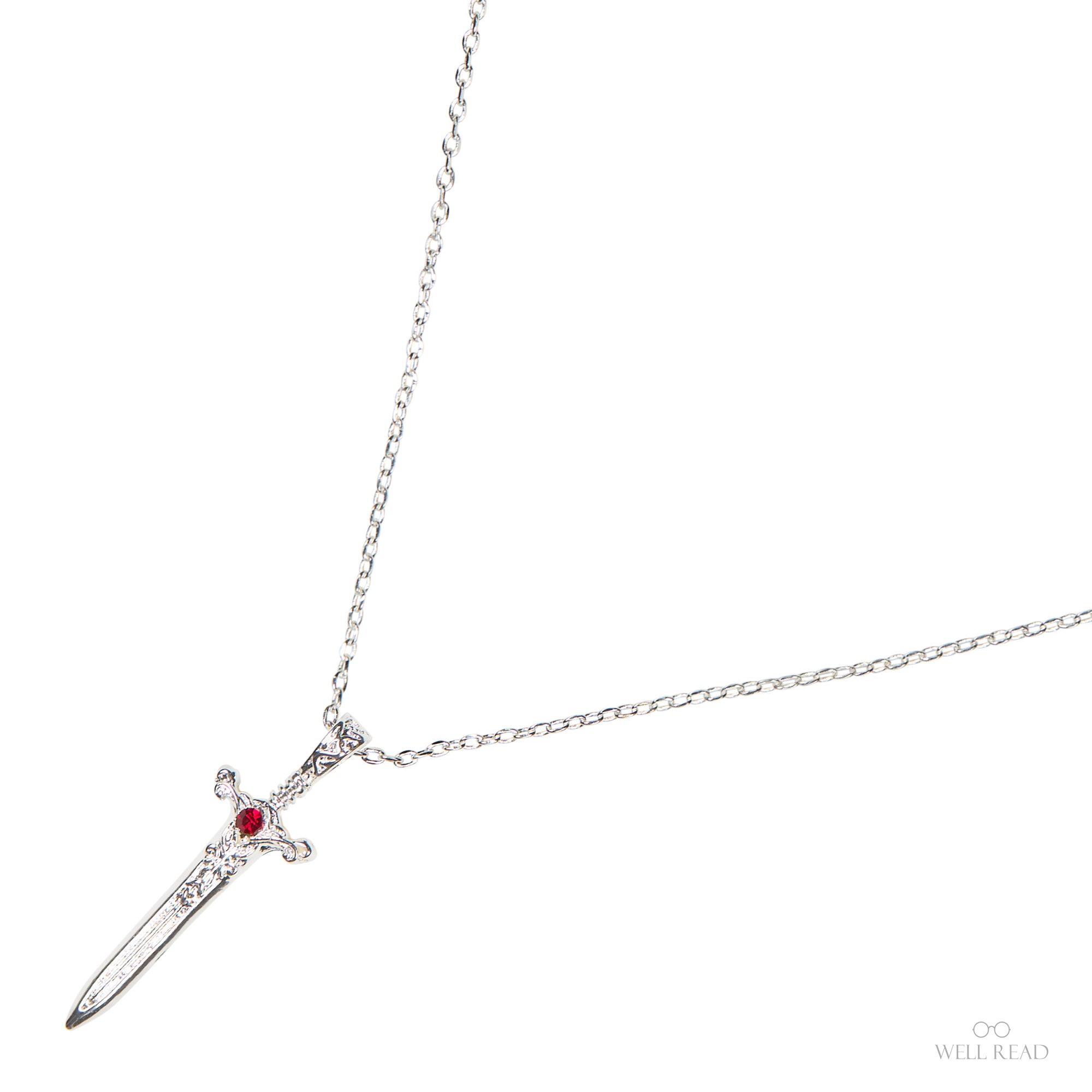 The pendant features a finely cast silver sword: a slim blade etched with storybook filigree, a scrolling crossguard, and a crimson stone set in the centre. Suspended from a delicate, adjustable chain, it balances mythic drama with everyday elegance—an ideal companion to our The Dragon Sword Chronicles book crossbody bag.