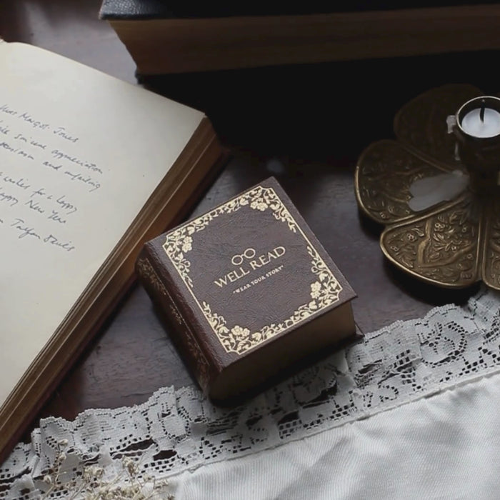 This charming, book-shaped jewellery box is the perfect home for your bookish necklaces. Its vintage-inspired design protects your jewellery and serves as a decorative piece. The luxurious velvet interior keeps your necklace tangle-free, whilst the exterior resembles a classic novel with intricate gold detailing. An ideal gift for book lovers and jewellery enthusiasts alike.