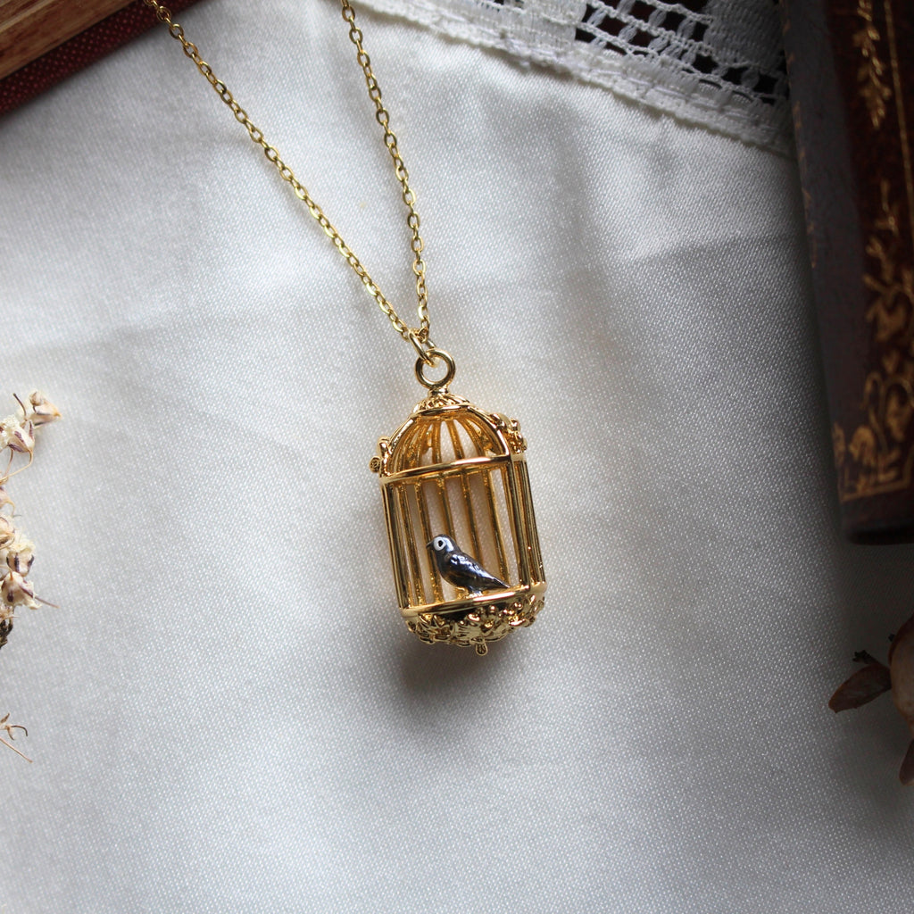 Introducing our Jane Eyre–inspired gold birdcage pendant necklace, a romantic homage to Charlotte Brontë’s classic. This delicate piece features a finely wrought golden cage cradling a tiny blue enamel painted bird—an elegant nod to Jane’s famous declaration, “I am no bird; and no net ensnares me.”