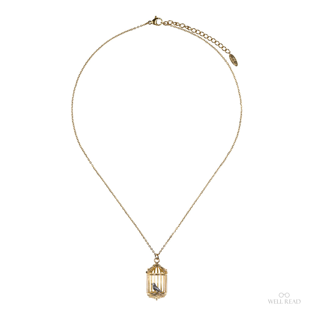 The pendant’s filigreed bars and domed top evoke Victorian ornament, while the little bird suggests resilience, self-possession, and the pull between confinement and freedom at Thornfield. Suspended from a lightweight, adjustable gold chain, it layers beautifully and sits comfortably for all-day wear—equally at home with a high-collared blouse or a cozy knit.