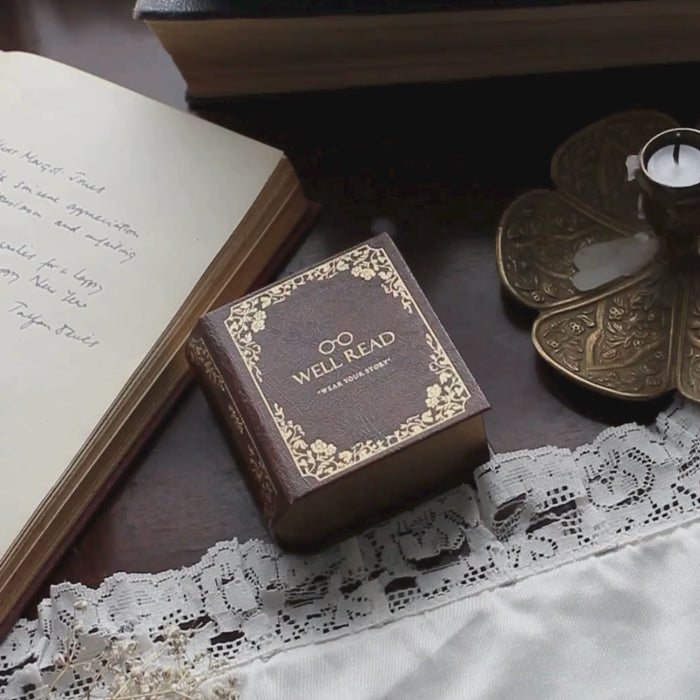 This charming, book-shaped jewellery box is the perfect home for your bookish necklaces. Its vintage-inspired design protects your jewellery and serves as a decorative piece. The luxurious velvet interior keeps your necklace tangle-free, whilst the exterior resembles a classic novel with intricate gold detailing. An ideal gift for book lovers and jewellery enthusiasts alike.