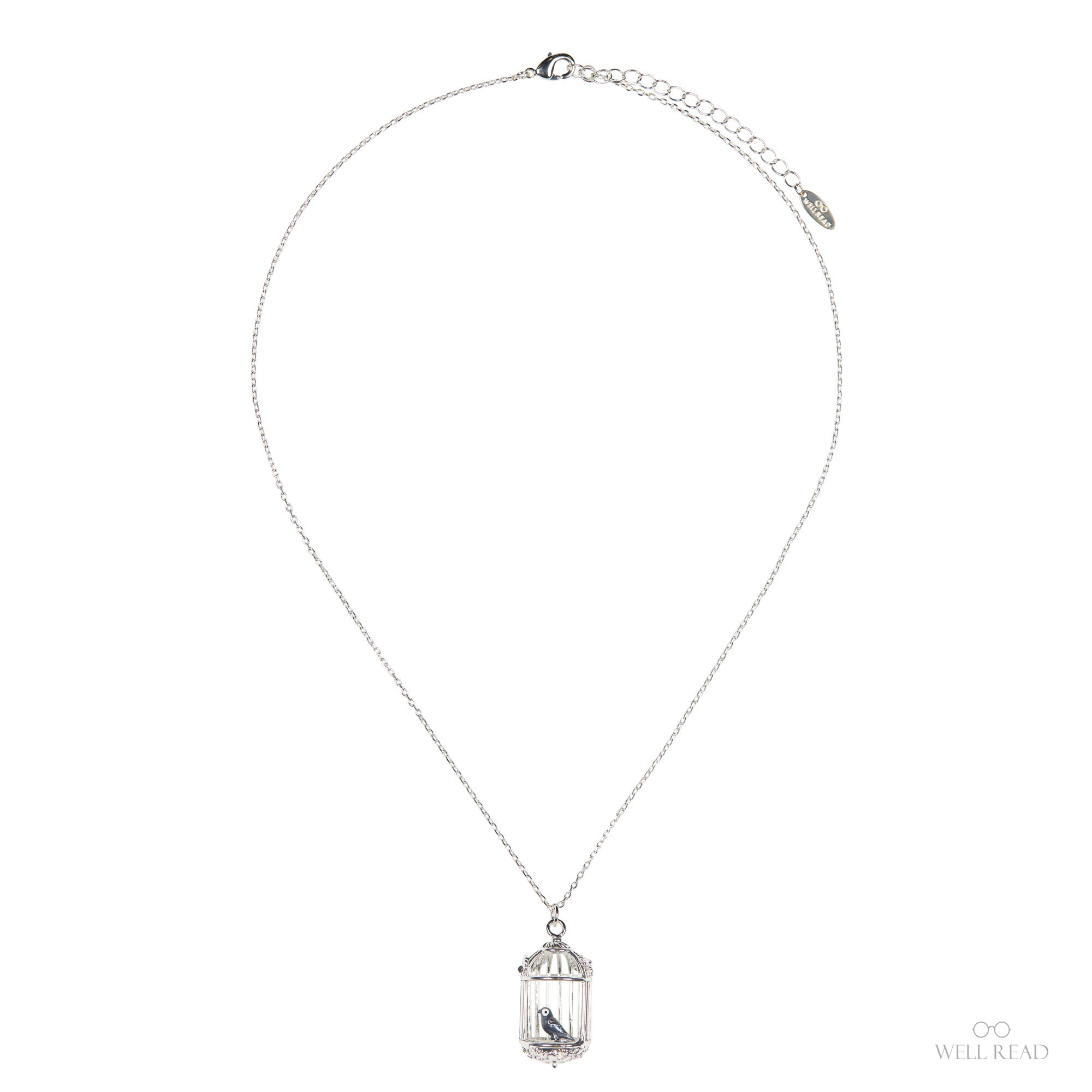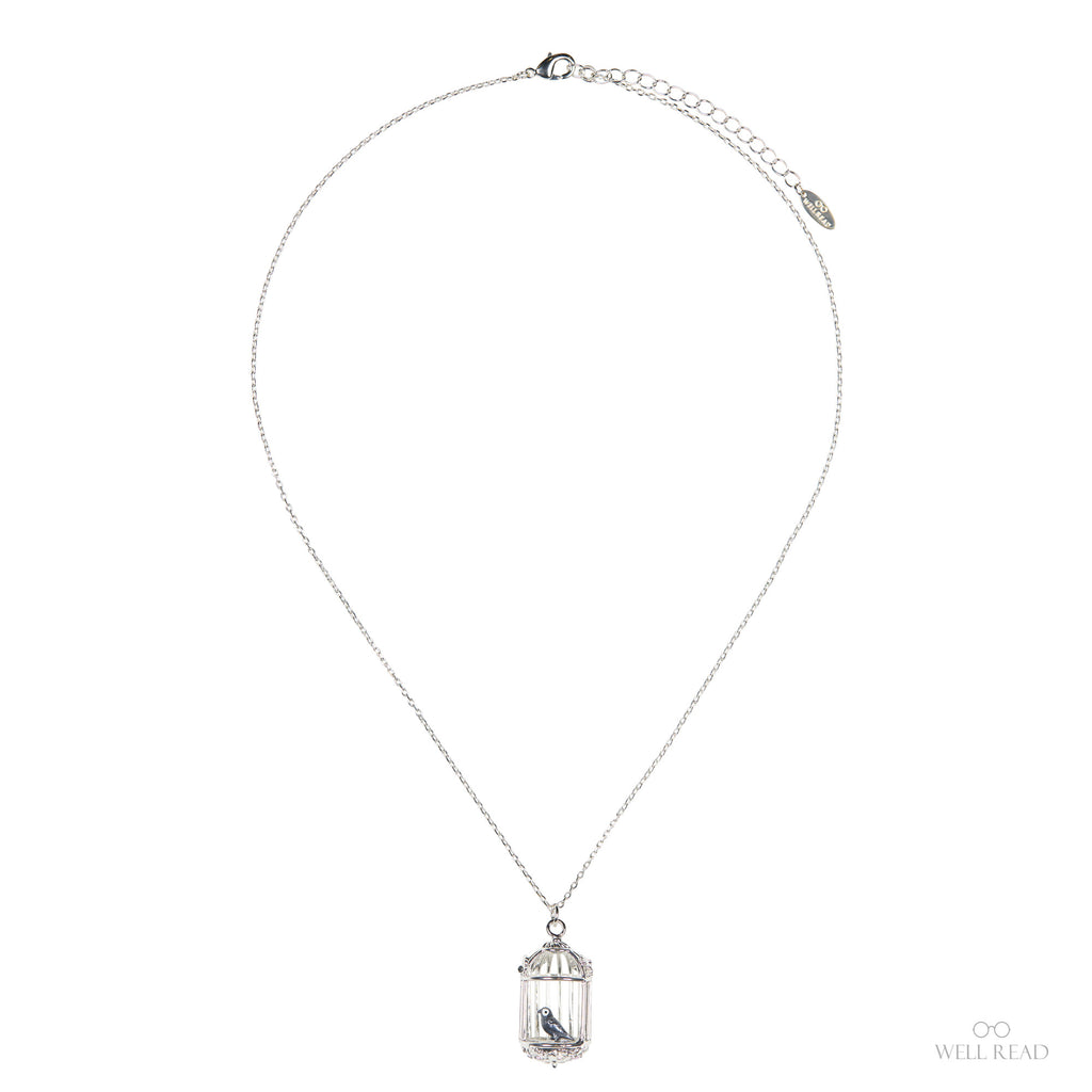 Introducing our Jane Eyre–inspired silver birdcage pendant necklace, a romantic homage to Charlotte Brontë’s classic. This delicate piece features a finely wrought silver cage cradling a tiny blue enamel painted bird—an elegant nod to Jane’s famous declaration, “I am no bird; and no net ensnares me.”