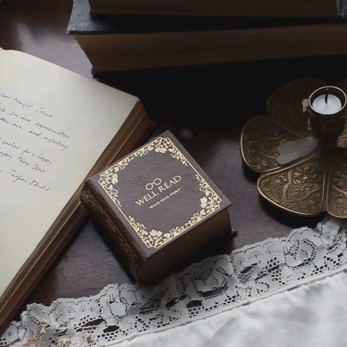 This charming, book-shaped jewellery box is the perfect home for your bookish necklaces. Its vintage-inspired design protects your jewellery and serves as a decorative piece. The luxurious velvet interior keeps your necklace tangle-free, whilst the exterior resembles a classic novel with intricate gold detailing. An ideal gift for book lovers and jewellery enthusiasts alike.